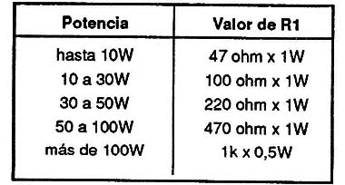 El resistor R1 tiene valores que dependen de la potencia del amplificador, según la siguiente tabla: