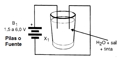 X1 - Vaso con agua y sal, más gotas de tinta y electrodos