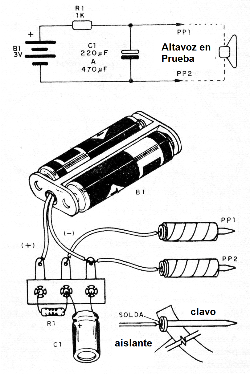 Observamos que el pulso sonoro sólo se emite en el instante en que ponemos las puntas de prueba en los terminales del altavoz. Para producir otro pulso es necesario alejar las puntas y dar unos segundos para que el capacitor se vuelva a cargar. En la figura 1 tenemos el diagrama y el montaje en puente de terminales.