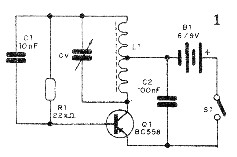 Lo que tenemos es básicamente un oscilador Hartley donde la frecuencia es determinada por L1 y CV. En el condensador CV hacemos el ajuste de la frecuencia. La banda dependerá de la bobina que puede tener de 20 +20 espiras de hilo 28 en un bastón de ferrita hasta 30 +30 espiras.