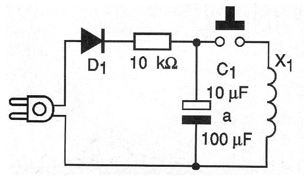 El diodo, el 1N4004 o 1N4007 según la red sea de 110 V o 220 V y el capacitor puede tener cualquier valor entre 10 y 100 uF. Para la red de 110 V la tensión mínima de trabajo recomendada es 200 V y para 220 V la tensión mínima es de 350 V. Su polaridad debe ser observada cuidadosamente.