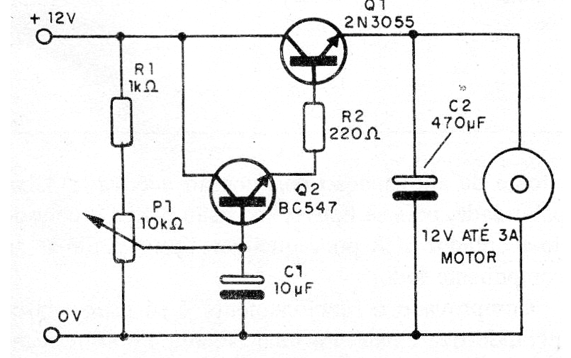 Este control utiliza dos transistores y puede controlar motores de corriente continua de 3 a 15 V con corriente máxima del orden de 3 A. El control es del tipo lineal y el transistor de potencia debe montarse en un buen radiador de calor.
