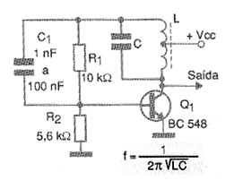 Los valores de C1 se eligen en función del rango de frecuencias a ser generadas, así como la bobina, que debe ser enrollada en un bastón de ferrita para las frecuencias inferiores a 20 MHz y sin núcleo superior a 20 MHz.