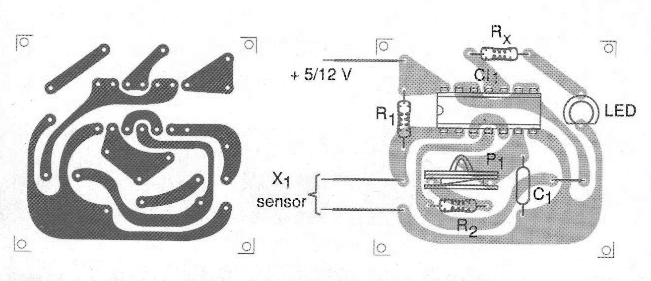 Cuando la resistencia entre los elementos del sensor cae a menos de 3 M ohms (valor determinado por R1), el LED parpadea en una frecuencia que se puede ajustar en el trimpot.