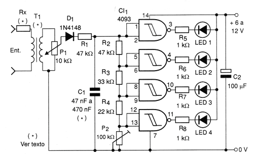 El circuito puede ser adaptado para operar con 2 4093 y así accionar hasta 8 LED en una escala. En este caso, la red de resistencias de entrada debe adaptarse.