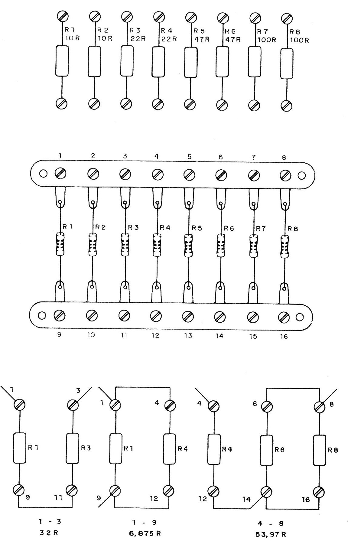 Con sólo 8 resistencias de valores comprendidos entre 10 ohms y 100 ohms podemos obtener resistencias entre 3 ohmios y 360 ohmios, aproximadamente; si multiplicamos los valores por 10 tendremos resistencias entre 30 y 3 600, y por 100, entre 300 y 36 000 ohms. Así, con tres conjuntos iguales podemos tener una amplia gama de valores experimentales de resistencias.