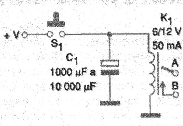 El relé debe tener tensión de acuerdo con la alimentación y la temporización será tanto mayor cuanto mayor sea la resistencia óhmica de su bobina. El tiempo final está determinado por el valor del capacitor usado.