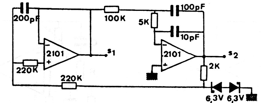 Este circuito fue encontrado en una publicación antigua. Los amplificadores operativos usados no son comunes actualmente, pero se pueden utilizar equivalentes modernos. La fuente de alimentación debe ser simétrica con tensión de acuerdo con el operacional y la señal generada es senoidal.
