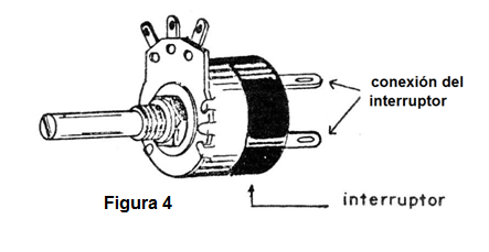 En la figura 4 damos el aspecto de un potenciómetro con llave, es decir, un potenciómetro que tiene incorporado un interruptor para encender y apagar la alimentación del aparato en el que está.