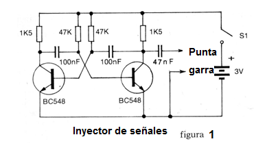 Este inyector consiste en un simple oscilador del tipo multivibrador que opera en la banda de audio, alrededor de 1 kHz generando una señal de potencia suficiente para excitar la mayoría de los pasos de los amplificadores de audio.