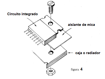 Después de retirar el mal integrado, coloque el nuevo en la misma posición. Después, con cuidado, fíjelo en el radiador de calor observando que puede existir un aislador de plástico o mica entre ambos. Si desea mejorar la transferencia de calor pase en el integrado y en el radiador un poco de pasta térmica (figura 4)