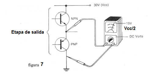 Otra medida importante es la de la tensión en la unión de los emisores de los dos transistores de salida, como muestra la figura 7.
