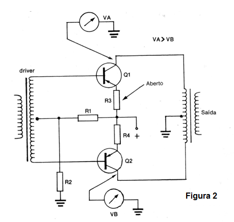 Si la etapa es en simetría complementaria, como muestra la figura 3, además de medir las tensiones en los transistores, vea también si el capacitor conectado al altavoz está en buenas condiciones.