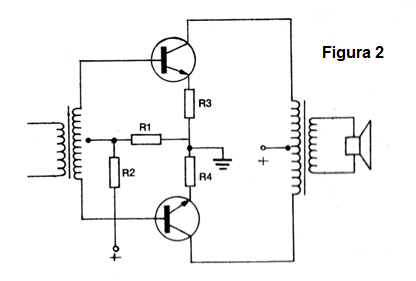El paso de salida clase B o push-pull lleva dos transistores del mismo tipo (par casado) y tiene la configuración mostrada en la figura 2.