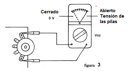 Con el interruptor abierto, es decir, apagado, debemos medir la tensión de la batería (3, 6 u otro valor). Con el interruptor cerrado debemos leer cero voltios, es decir, la aguja debe quedar a la izquierda.