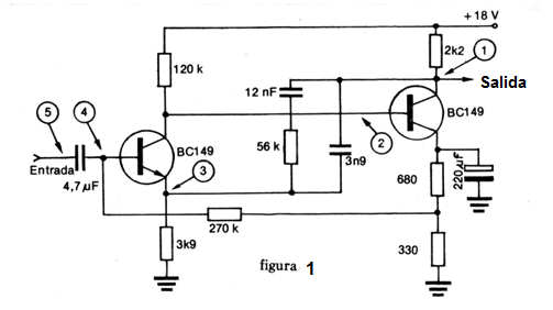 Un circuito típico de paso preamplificador se muestra en la figura 1.