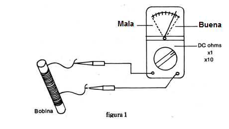 Las bobinas de antena también deben presentar una resistencia muy baja, alrededor de 0 ohmios cuando en buen estado, ya que la cantidad de hilo usado es pequeña. Encojando las puntas de prueba en los terminales de la bobina, el puntero debe ir todo a la derecha.