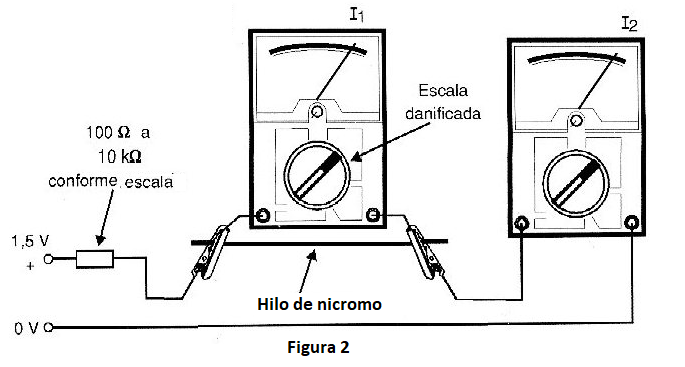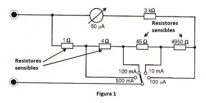 El resistor más sensible en los multímetros es el de la escala de corrientes (shunt) que se quema cuando la corriente sobrepasa cierto límite, como muestra la figura 1.