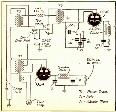 En 1942, cuando se publicó este circuito, todavía se usaban vibradores en los automóviles para convertir 12 volts de la batería en alta tensión para radios de válvulas. El circuito hace uso de 2 válvulas dobles y 3 transformadores para tener una prueba completa de vibradores.