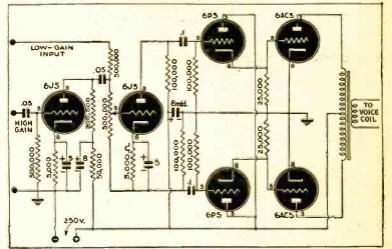 Con unas pocas decenas de watts, este circuito fue encontrado en una publicación americana de 1944. El circuito no muestra la fuente de alimentación y para mayor potencia utiliza válvulas en paralelo en la etapa de salida.