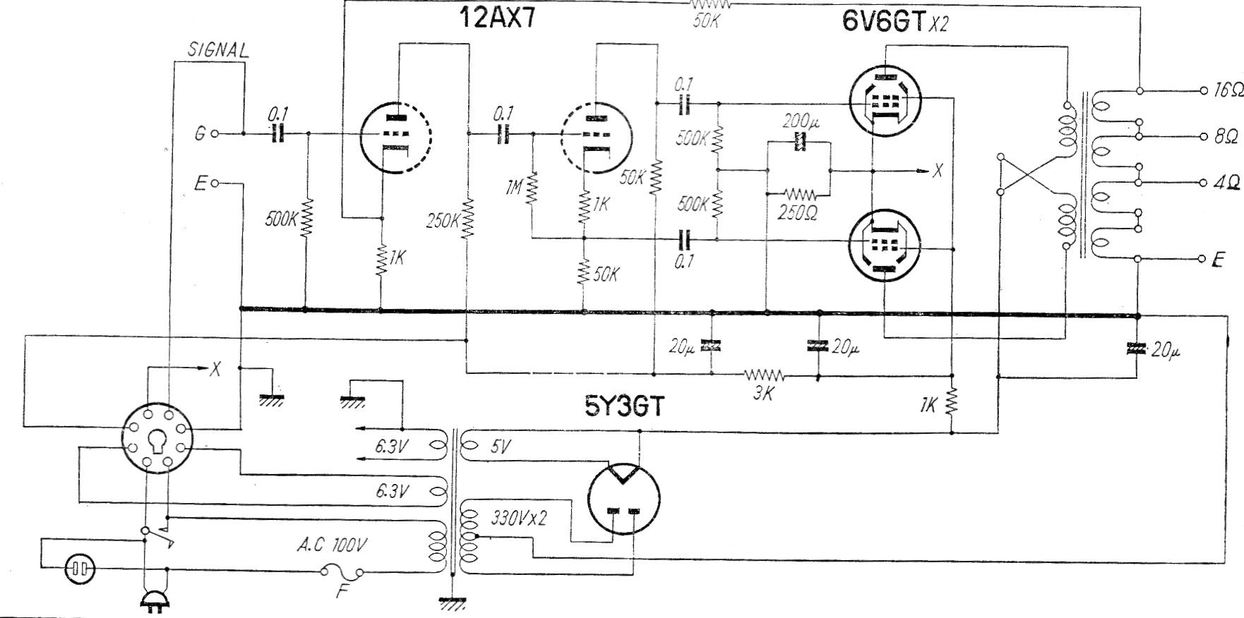 Este es el circuito de un amplificador comercial (modelo HF 10A-M) fabricado en Japón en los años 60 El circuito tiene un rango pasante de 20 a 20 000 Hz con 0,5% de distorsión. La fuente de alimentación se incluye en el dibujo.