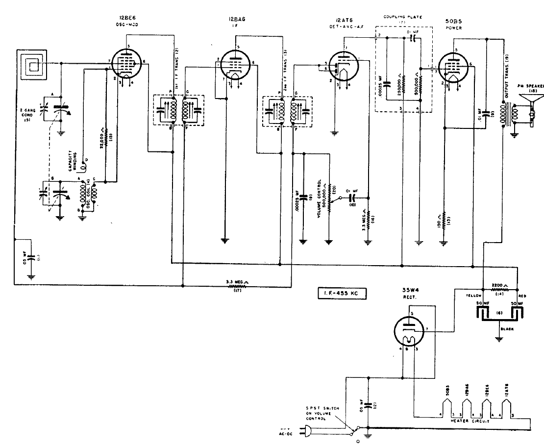 Este circuito de marca poco conocido fue obtenido en un esquemario de la época. El uso de la configuración tradicional en la época con antena de cuadro y filamentos en serie, encontrada en muchos radios brasileños de la época.