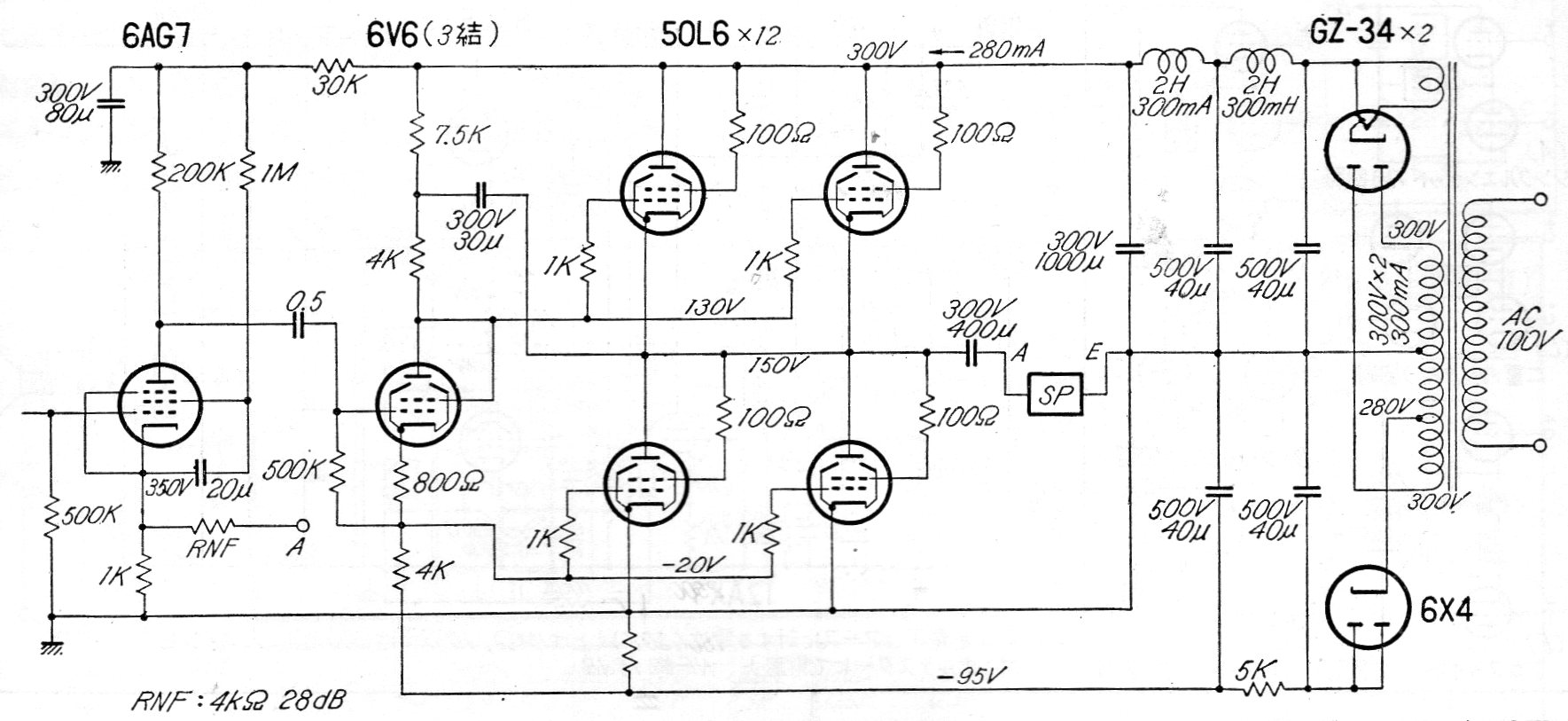 Este circuito SEPP utiliza dos válvulas 50L6 en la salida con acoplamiento del altavoz por el cátodo posibilitando el uso de unidades de baja impedancia. La potencia es baja del orden de 1 o 2 W, pero la calidad de sonido es buena.