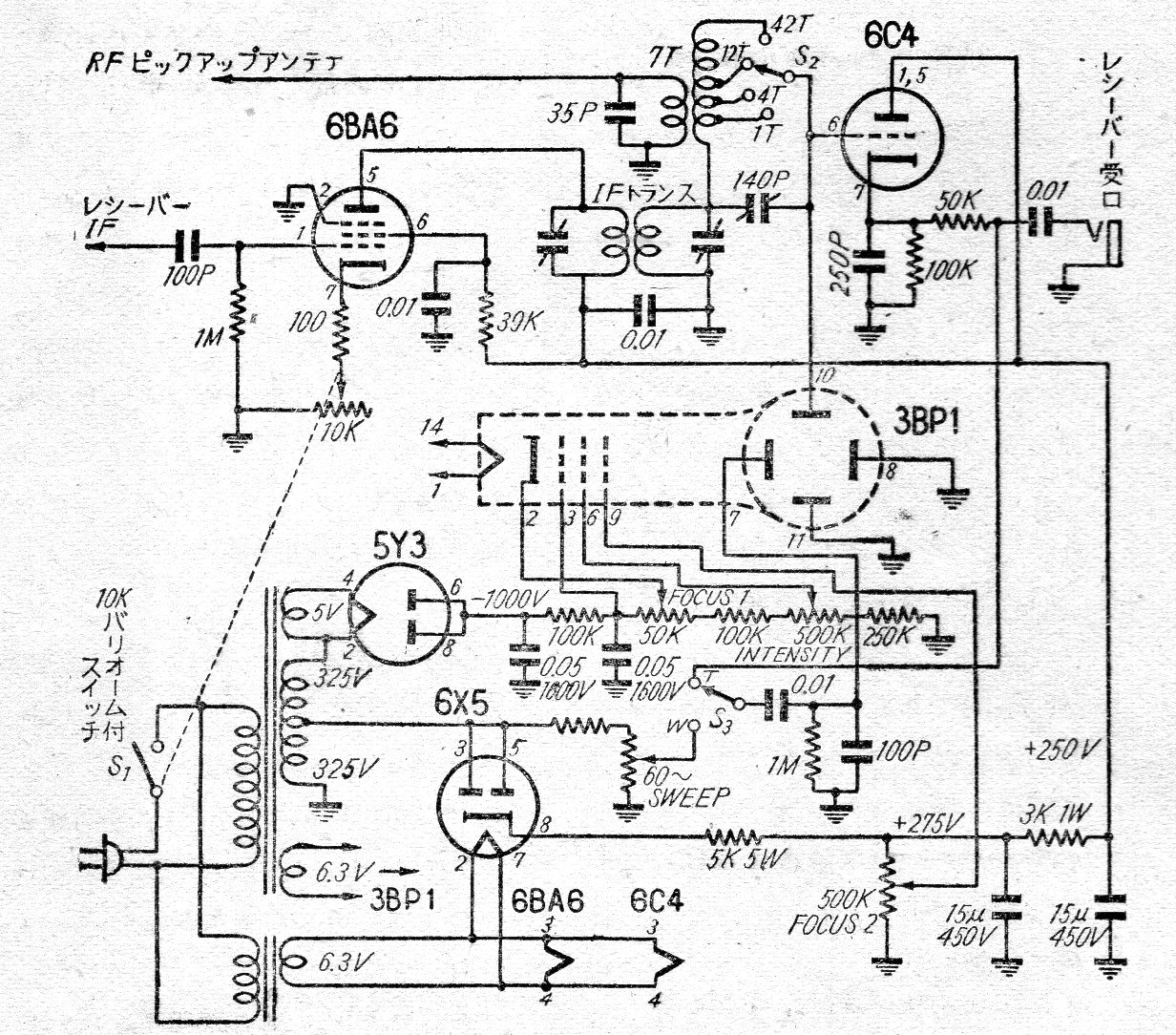 El circuito presentado en una documentación de 1955 utiliza 4 válvulas, además del TRC, siendo bastante lento, respondiendo a señales sólo en la banda de pocos megaciclos, por las características de los componentes usados.