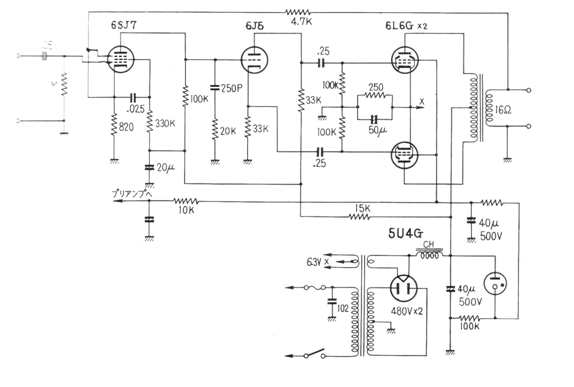 Este circuito de amplificador de audio valvulado se encontró en una revista técnica japonesa de 1961. Los componentes son comunes para la época y la fuente de alimentación se incluye en el diagrama. La salida es en push-pull con la inversión de fase hecha por válvulas. El condensador de entrada es de 0,05 uF.