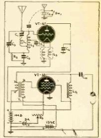 Encontrado en una revista de 1943, en plena guerra, este circuito no era tan compacto como pudiera parecer, ya que requería de grandes y pesadas baterías para alimentarlo. El circuito operaba en el rango VHT y era del tipo superregenerativo con buena sensibilidad, pero poca selectividad, como es característico de este tipo de configuración.