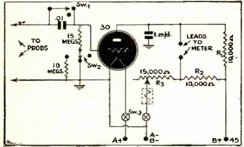 Este circuito se encontró en una publicación de 1943. Usando un solo tubo, presenta una alta resistencia de entrada. No se proporcionó la fuente de alimentación y el indicador es un miliamperímetro.