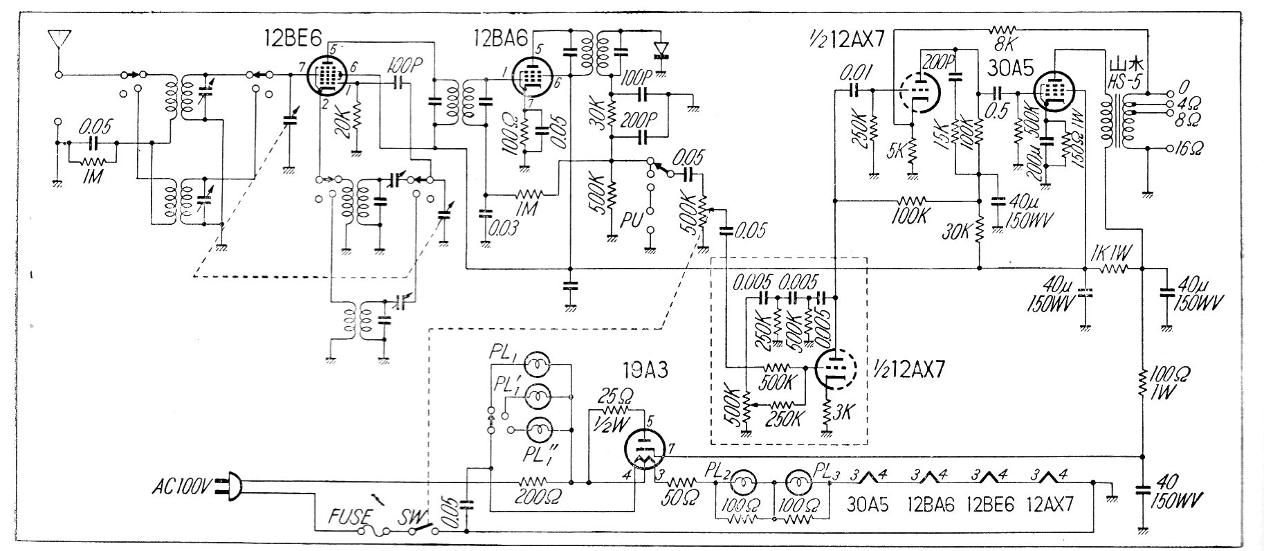 Esta radio tocadiscos con alimentación directa sin transformador fue encontrada en una documentación japonesa de los años 60. El circuito tiene dos bandas de onda, recibiendo ondas medias y cortas hasta 18 MHz, haciendo uso de componentes comunes en la época. Observe el uso de dos lámparas en serie con el filamento para reducción de tensión y otras para el + B.