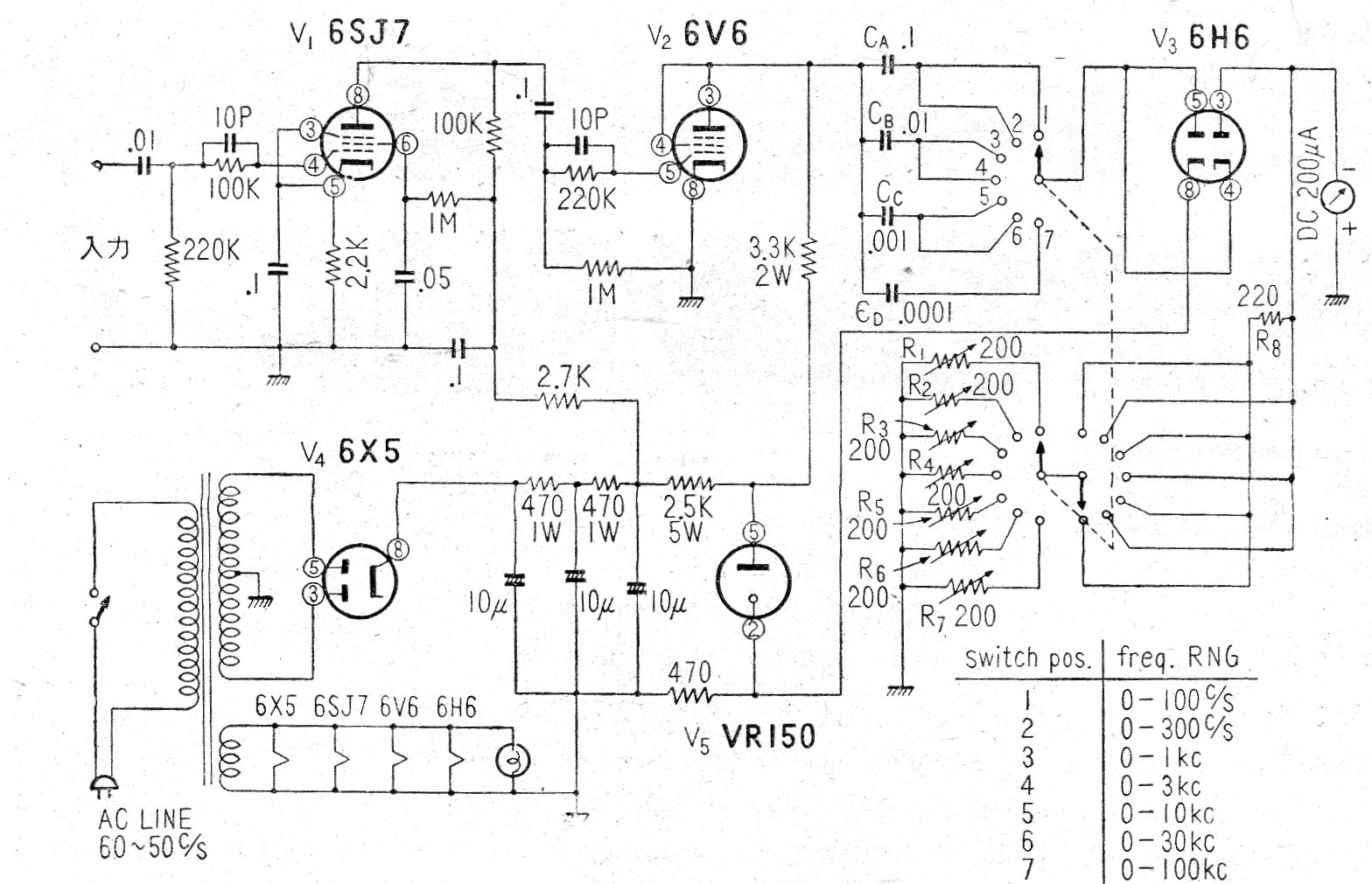 Este es el circuito de un frecuencímetro de audio comercial de los años 60. El circuito emplea 4 válvulas y la precisión de las señales medidas depende de la precisión de los componentes de selección de frecuencias. El circuito mide señales en bandas de 100 Hz a 100 kHz.