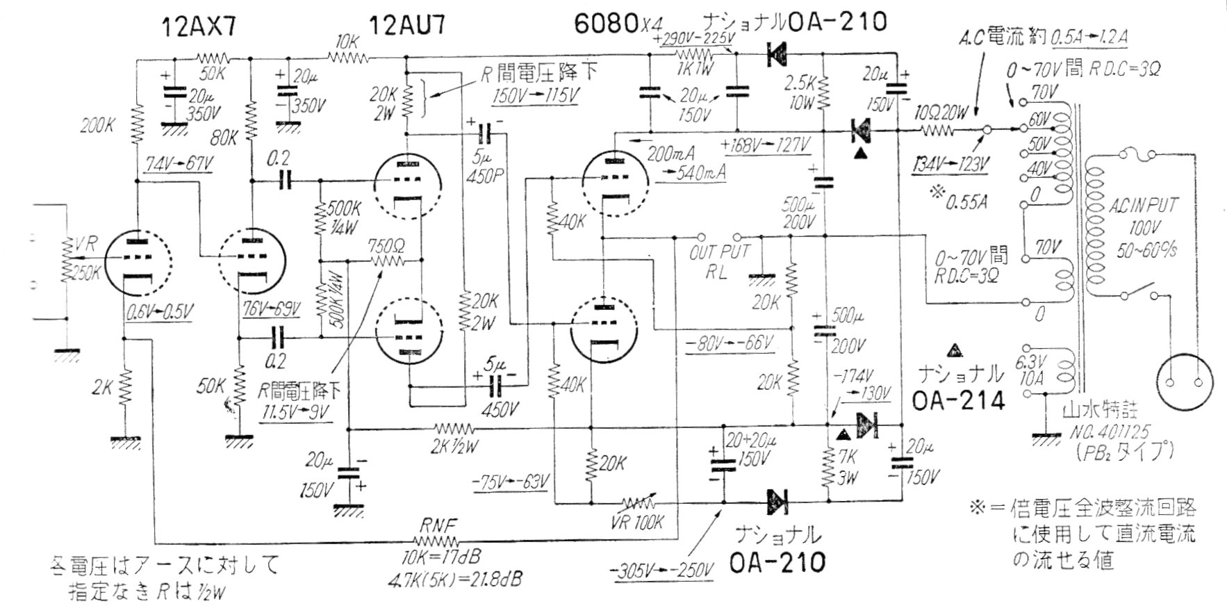 Encontramos este interesante circuito amplificador de potencia en una documentación japonesa de los años 60. El circuito no utiliza transformador de salida pudiendo alimentar directamente altavoces de 16 ohms con una potencia de 20 W. El circuito incluye de la fuente de alimentación que usa diodos semiconductores.