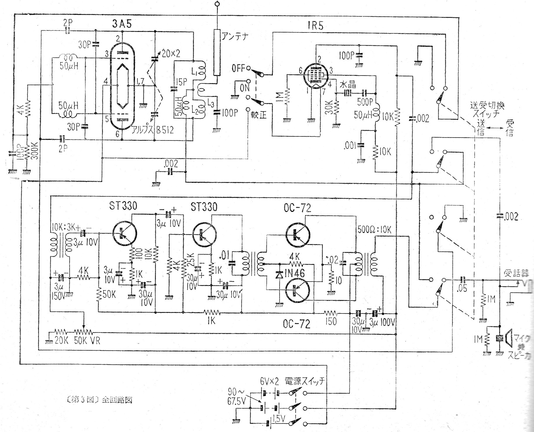 Este circuito de los años 50 muestra cómo era la tecnología de la época en un walk-talkie valvulado que usaba varias baterías, incluso de 90 V. El circuito usaba válvulas y transistores de la época.