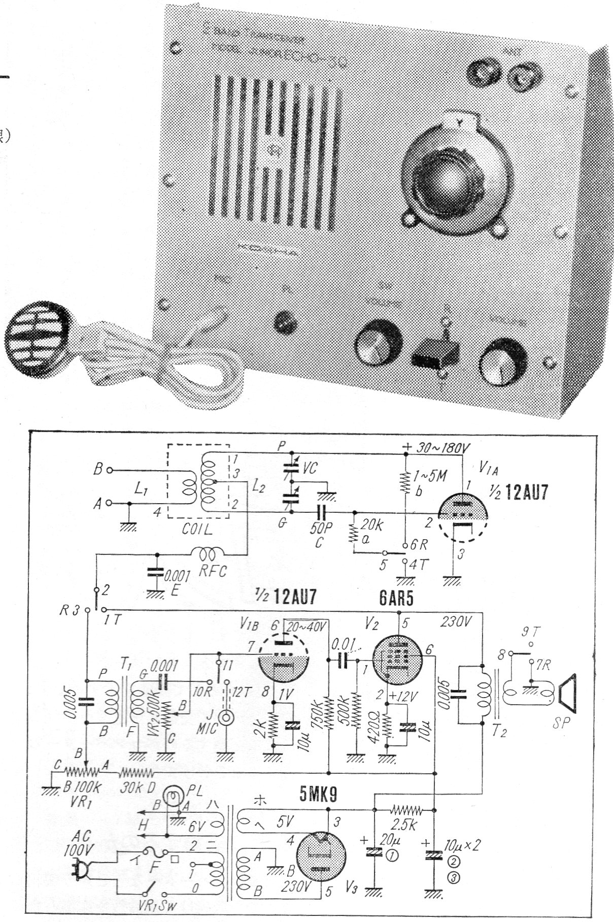 Este circuito de transceptor valvulado de pequeña potencia fue encontrado en una publicación japonesa de los años 60. El alcance depende de la antena y también de las condiciones de propagación. Las pistas pueden ser las de radioaficionados PX y PX de 10 y 11 metros.