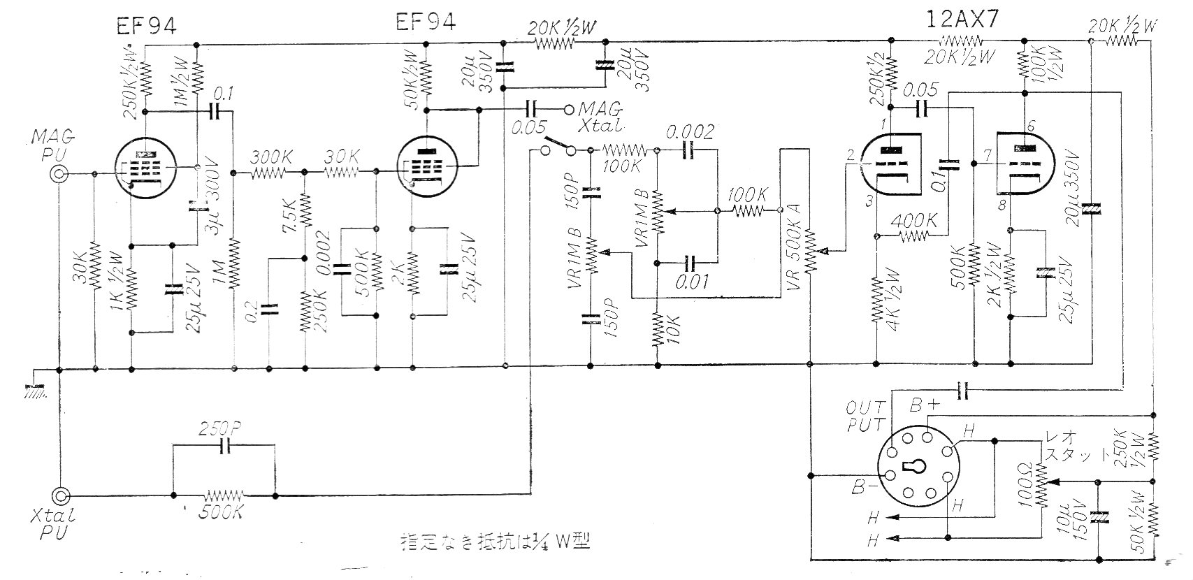 Este bien elaborado preamplificador para tocadiscos fue encontrado en una documentación japonesa de los años 60. El circuito tiene entrada para fonocaptores de cristal y magnéticos y ecualización incluyendo un control de tono tipo Baxandall. La alimentación se obtiene del propio amplificador con el que debe funcionar.