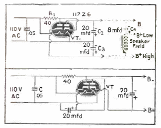 En la figura tenemos un circuito con dos opciones de fuente sin transformador. El circuito es de una documentación de 1944. Para alimentar los filamentos de los circuitos alimentados se necesita un transformador adicional.