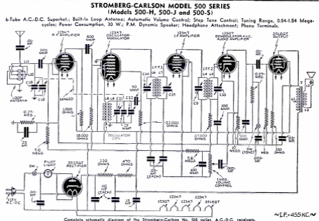 Otro tubo de válvula de la década de 1940. Este superheterodino de 6 tubos estaba destinado a sintonizar el rango de onda media. Era un receptor DC-AC con filamentos en serie y sin transformador en la fuente de alimentación. Diagrama que tiene muchas similitudes en este momento y en los años siguientes.