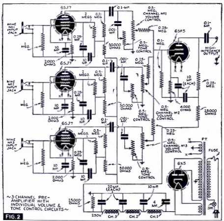 Este mezclador para sonido envolvente o mesa de mezclas se encontró en una publicación de 1940. Se utilizan 4 válvulas para 3 entradas, pero se puede ampliar el número de entradas. El circuito tiene una buena fuente con rectificador de onda completa y se debe redoblar el cuidado con los blindajes en el caso de un montaje.