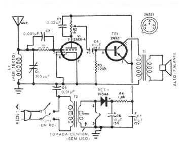 Este circuito fue encontrado en una traducción de publicación americana de 1963. En la versión original utiliza una antena de cuadro, pero podemos emplear una antena de ferrita formada por 100 espiras de hilo 28 en un bastón de 15 a 25 cm de longitud. El resistor de rejilla apagado en el escaneado de la imagen de 10 M ohms. El transistor puede ser el BD136 y el transformador de salida es del tipo encontrado en radios transistorizados. R2 ajusta el volumen y el capacitor variable se puede obtener en antiguos radios valvulados. El transformador de alimentación tiene un secundario de 12 V x 1,5 A.
