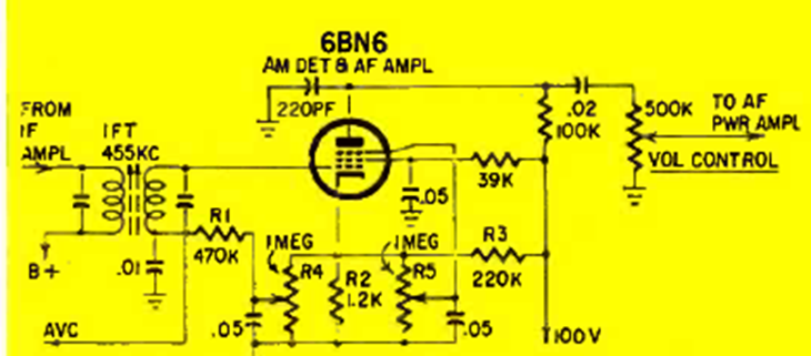El diagrama de una Radio Electrónica de junio de 1964 muestra una etapa de detección de AM y al mismo tiempo un amplificador de un receptor común con una FI de 455 kHz. El circuito era común en los receptores de época.