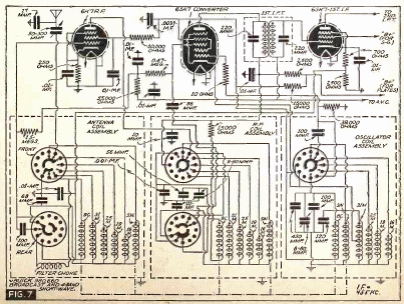 En la figura tenemos un circuito convertidor, amplificador y paso de FI de un radio multibanda. El interruptor selector selecciona bobinas para los diferentes rangos, siendo el circuito muy crítico con los ajustes. Muchos receptores de comunicaciones utilizaron esta configuración con interruptores especiales de muy baja capacitancia y resistencia para tener una respuesta de frecuencia plana en todas las bandas.