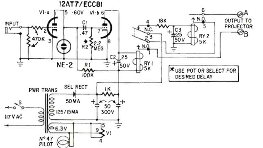 Diseñado originalmente para controlar un proyector de diapositivas, este circuito se encontró en Radio Electronics de junio de 1964. El circuito utiliza una válvula doble y acciona un relé de alta tensión. La fuente de alta tensión incluida. La revista incluye una descripción del montaje.