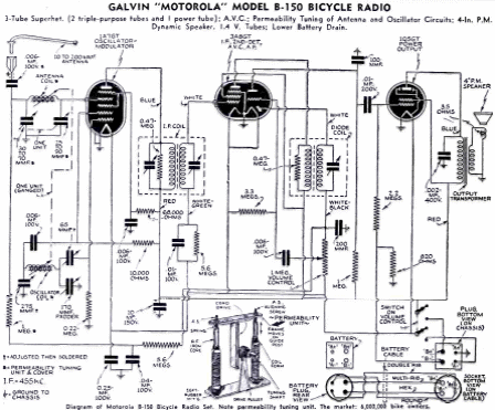 Este interesante receptor de tubo de onda media de la década de 1940 fue diseñado para su uso en bicicletas. Al ser un superheterodino, tenía buena sensibilidad y alimentaba un altavoz. La FI era de 455 kHz y la configuración era bastante compacta.