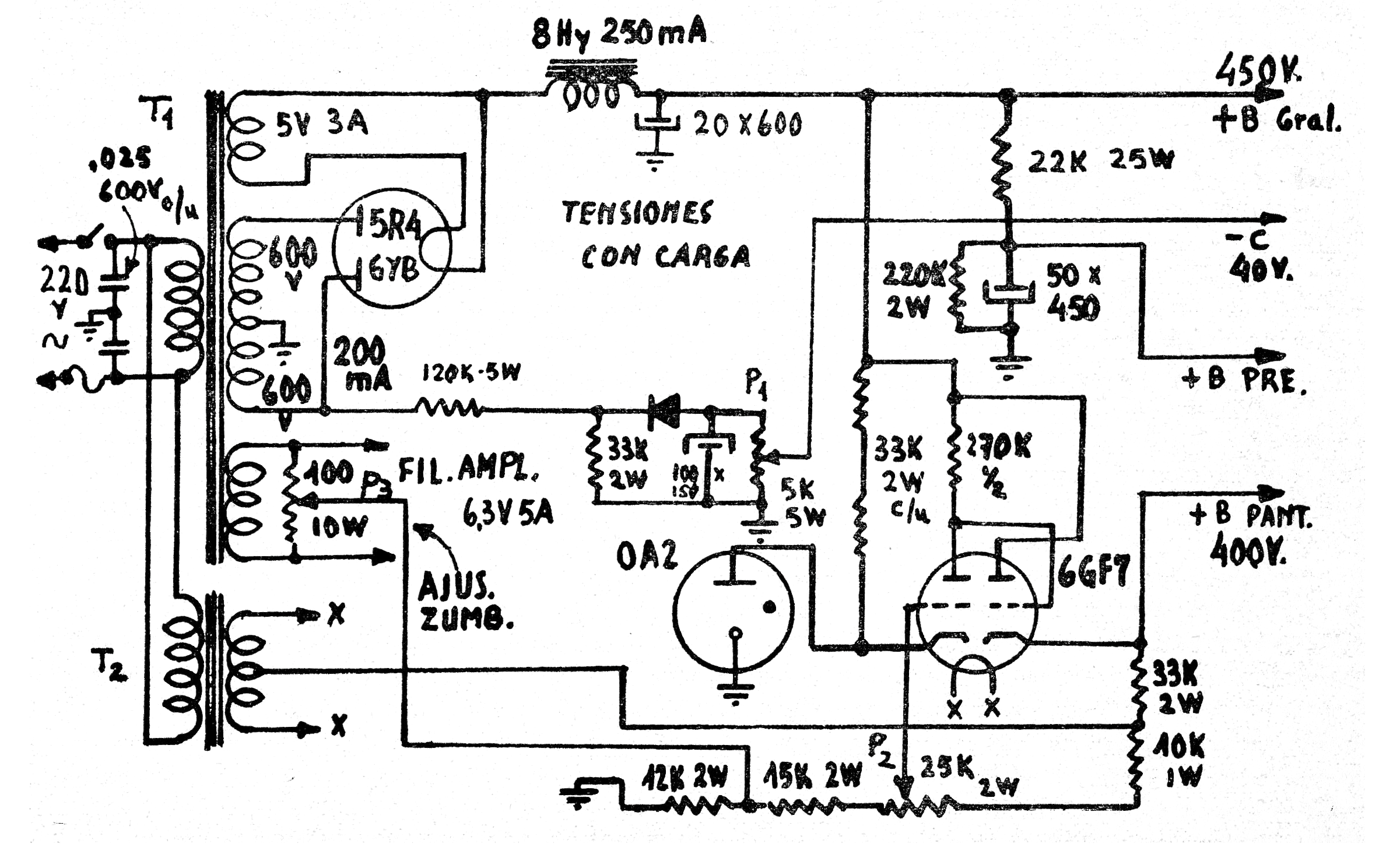 Esta fuente es de una documentación técnica antigua de RCA, fabricante de las válvulas utilizadas. El circuito, además de las fuentes de potencia, tiene una salida regulada por la válvula OA2 para polarización de rejilla, garantizando así estabilidad de funcionamiento al circuito. Los componentes críticos, además de las válvulas son los transformadores y el choque de filtro.