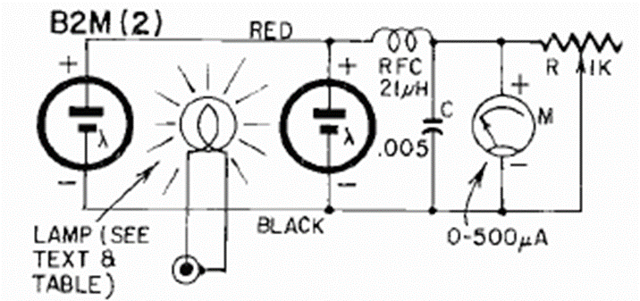 Este circuito utiliza una lámpara impulsada por el anillo de Hertz y mide su brillo con células fotovoltaicas comunes. El circuito es de una Radio Electronics de febrero de 1964.