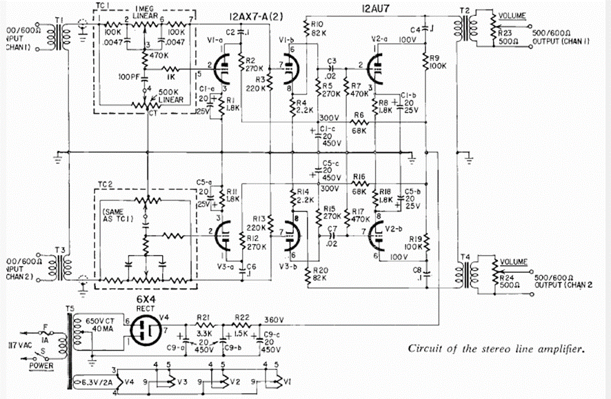 Originalmente indicado para aplicaciones en distribución de sonido a través de líneas de 600 ohms, este circuito fue lanzado en Radio Electronics en febrero de 1964. El circuito utiliza válvulas conocidas y tiene un rendimiento excelente para distribuir señales estéreo. La alimentación se realiza mediante capacitor de triple filtrado.