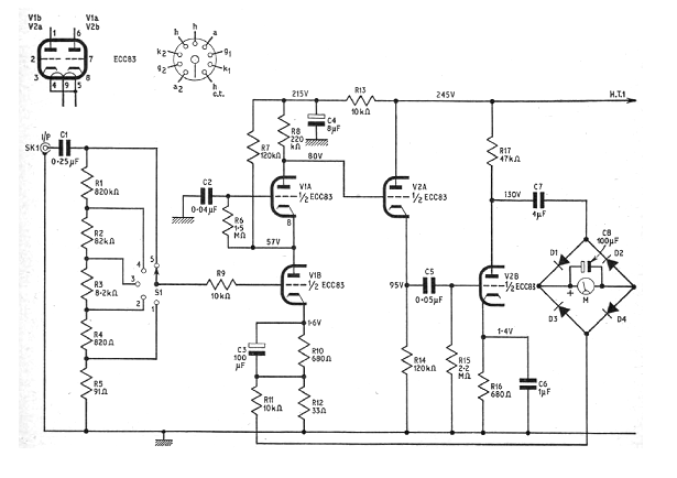 El circuito presentado es de una documentación de 1965. La fuente de alimentación es de 250 V y la precisión dependerá de las resistencias usadas. El instrumento indicador es de 1 mA de fondo de escala.