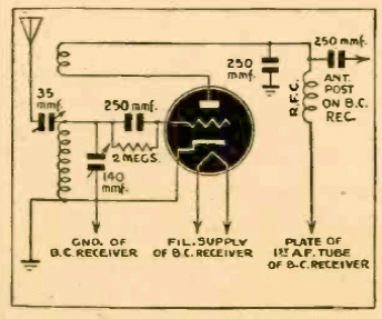 Este circuito regenerativo le permite recibir señales de onda corta para su amplificación en un amplificador de audio común. Las bobinas se pegan según la banda de onda. La válvula puede ser del tipo 27 o 56 como en el original, o tipos más modernos.